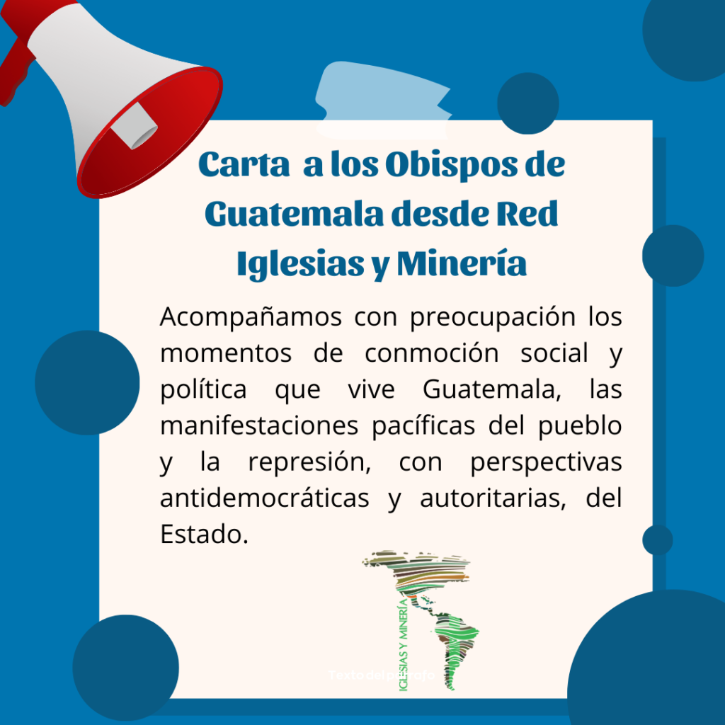 Latinoamérica, 20 de noviembre, 2023 Monseñor Rodolfo Valenzuela Núñez Presidente de la Conferencia Episcopal Guatemala Estimados Hermanos Obispos de Guatemala, Paz y Esperanza en Cristo, nuestro Maestro y Buen Pastor. La Red Iglesias y Minería acaba de realizar su Encuentro Continental en la Ciudad de Guatemala, de 3 a 7 de noviembre. Fue un tiempo […]